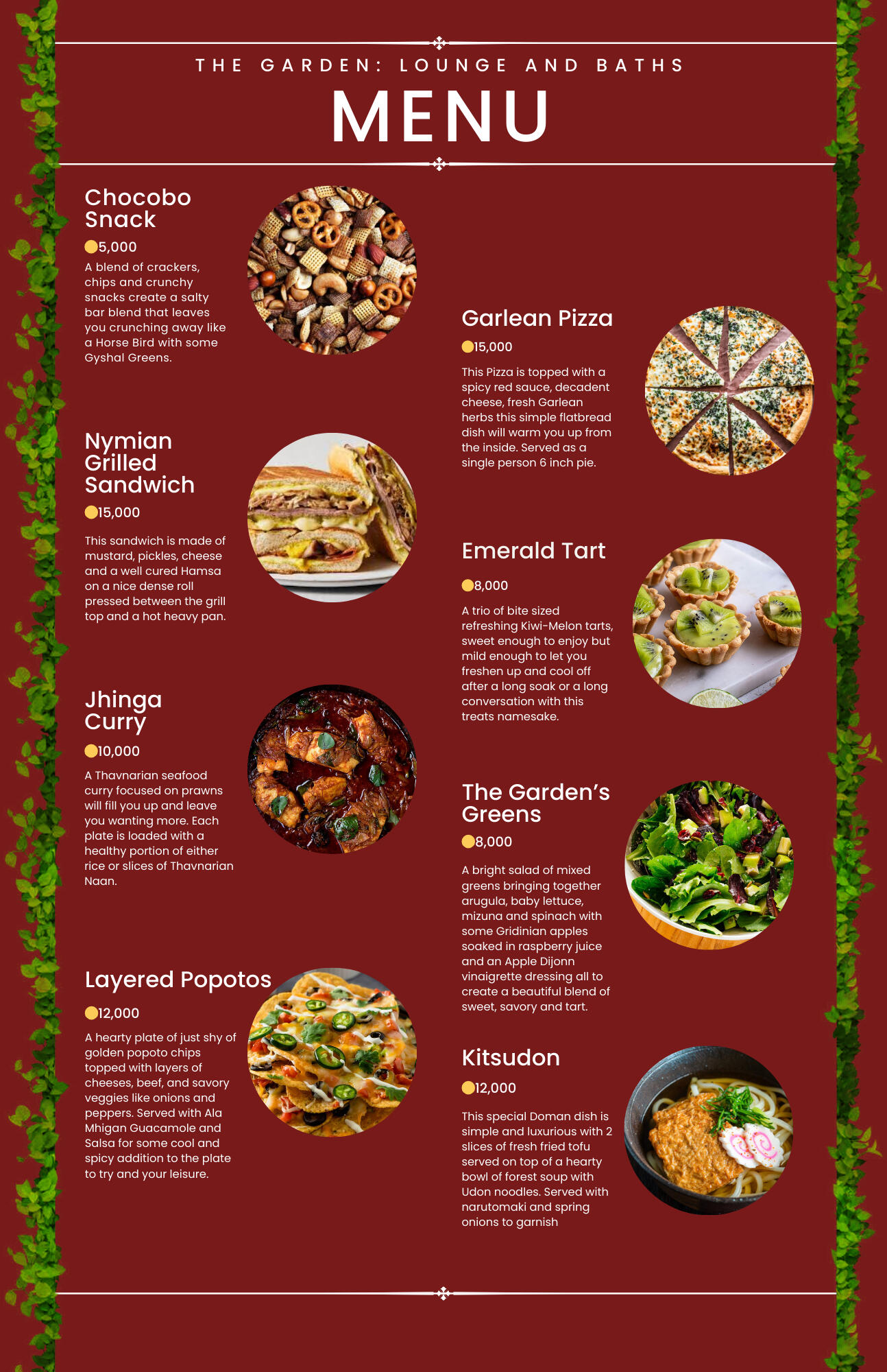 October 4th, 2025❁ Meal of the Week: Dodo Desert Stew ❁A slow-simmered Thanalan-style stew that captures the spirit of early autumn nights in the desert. Tender chunks of braised dodo thigh and sun-browned tubers swim in a broth infused with roasted garlic, smoked paprika, and a splash of rich ale from the city of Ul’dah. Jt finishes it with a swirl of fire-pepper oil and a sprinkling of crisp onion shavings, giving the dish a subtle burn that warms from the inside out.August 23rd 2025:❁ Dessert of the Week: Rolenberry Cheesecake ❁Description:Description: