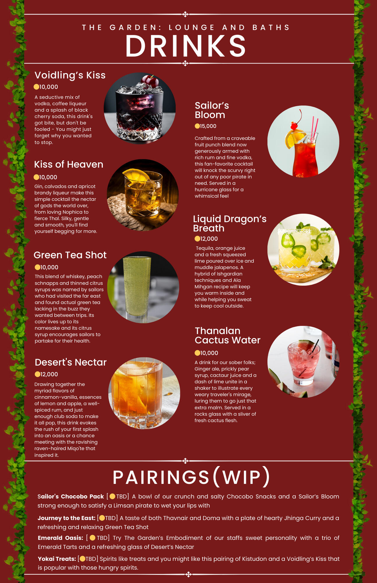 Head ChefDon’t let the smirk fool you—Jericho’s hands know fire, flavor, and a little bit of danger. As The Garden’s Head Chef, he’s the one behind our most memorable dishes and cocktails, blending bold Thanalan heat with unexpected notes of elegance. Whether he’s crafting a one-night-only special or pouring a Voidling’s Kiss with a knowing glance, Jericho brings charm, bite, and a whole lot of spice to your table. He doesn’t just serve food—he serves moments. Ask nicely, and you might just get a taste of something unforgettable.